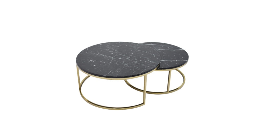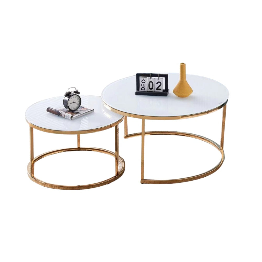 Voici un ensemble de deux tables basse gigognes de tendance art déco avec dessus rond en verre trempé leur donnant un aspect très tendance.