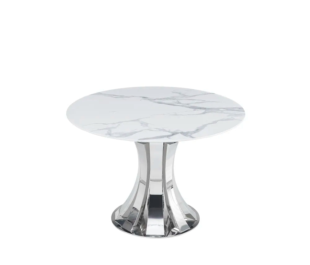 Table à manger JUDITH RONDE CHROME PLATEAU CERAMIQUE MARBRE BLANC 120cm